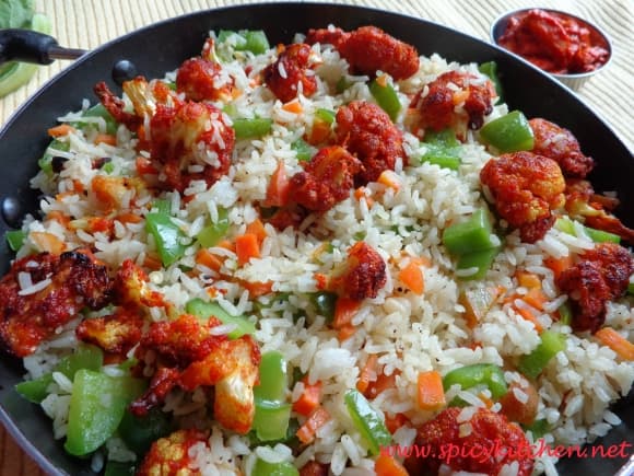 This fried rice is a complete meal which does not need any side dish. But you can have it with tomato sauce, or any non vegetarian staters.