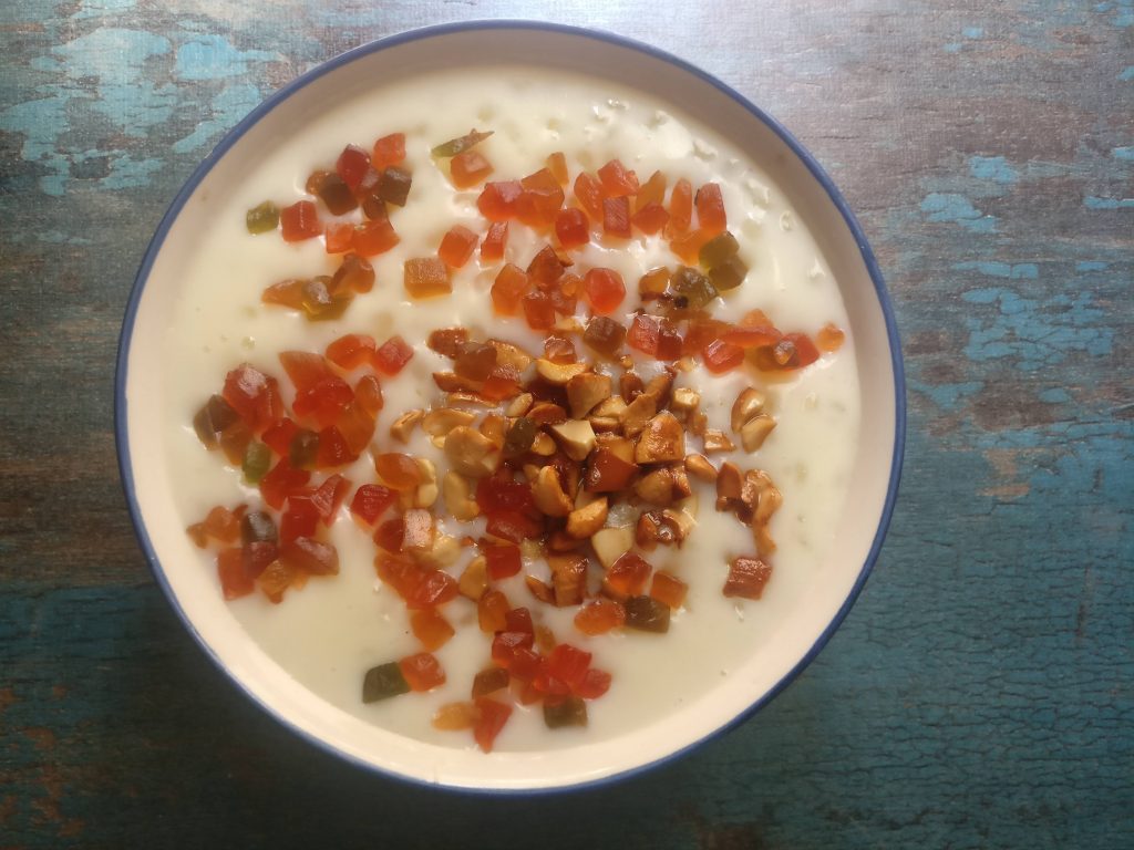 Turn off the flame. Allow the kheer to cool. During the time of serving heat butter in a nonstick pan and nuts. Golden fry and add to kheer. This will give crunchy taste to the nuts. Garnish with tutti frutti.